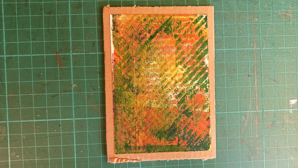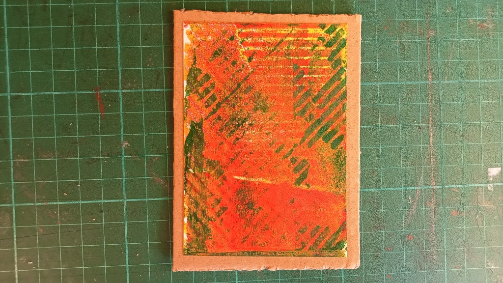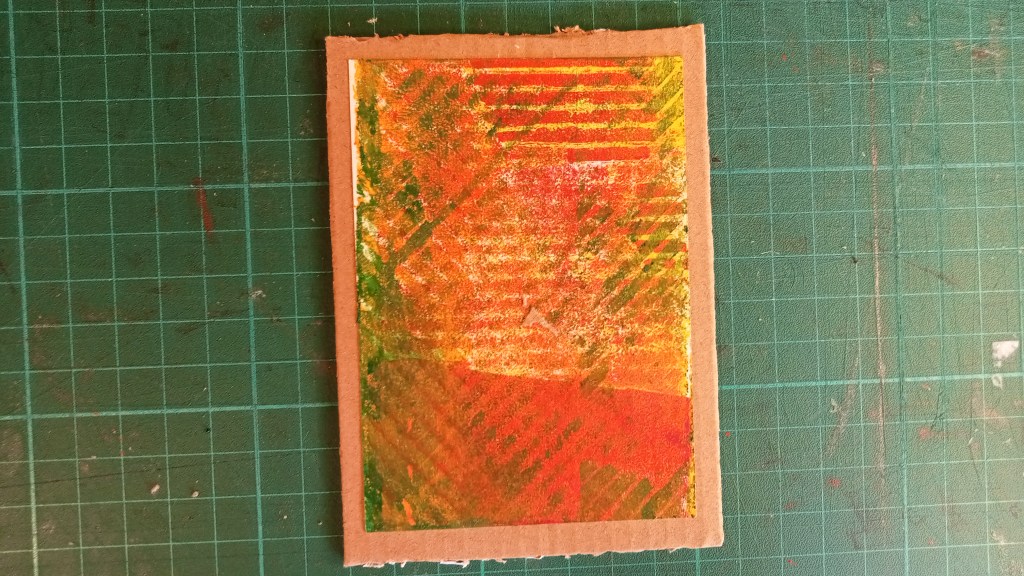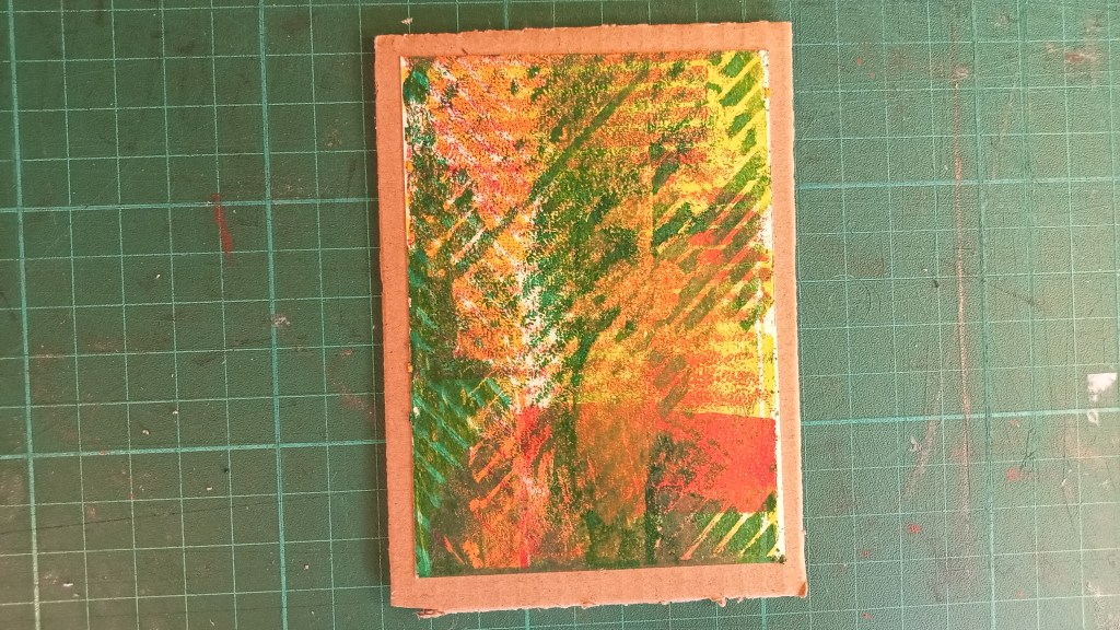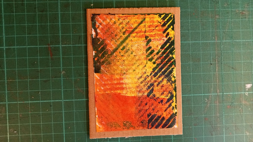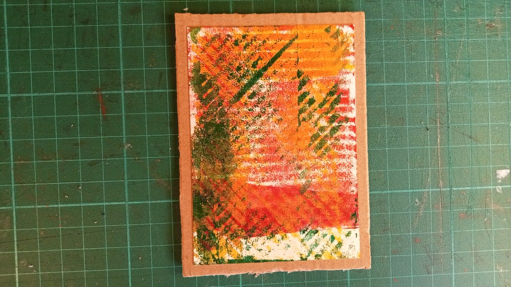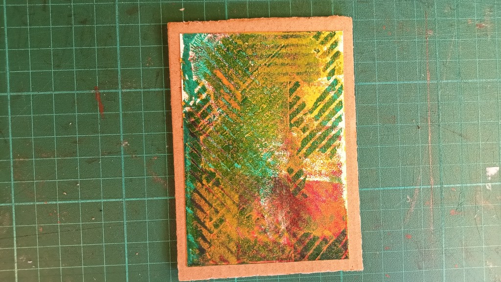 In this series, I removed some ink from the Gelli using a plate (made from an old pizza box) just before placing the paper on top.