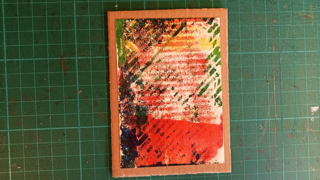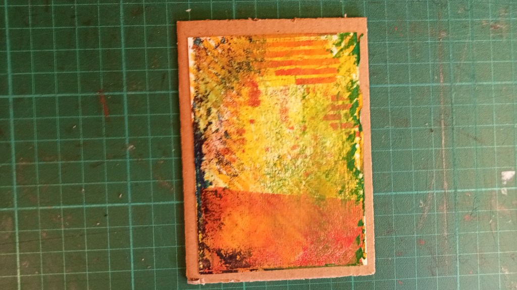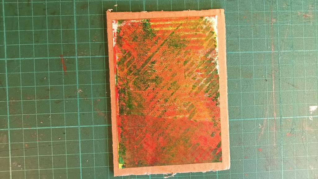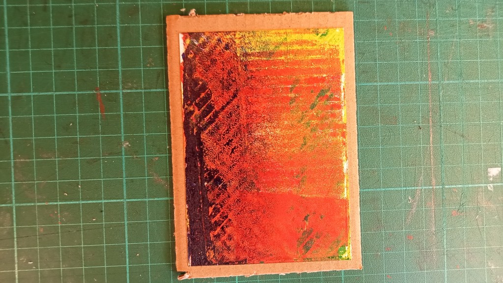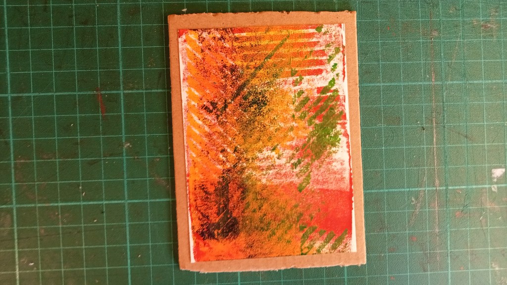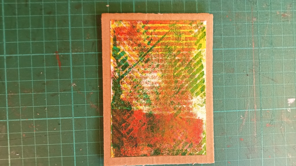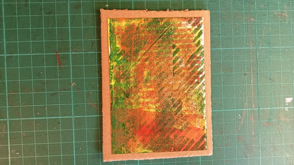 In this series, I removed some ink from the Gelli using a plate (made from an old pizza box) just before placing the paper on top.