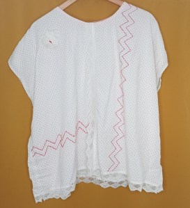 One of my new makes needed a little extra thought. Off-cuts became a lace flower detail, finished with the perfect button Alan found in the big box of buttons gifted by our lovely neighbour, Hei. No one sees the tear now… right?